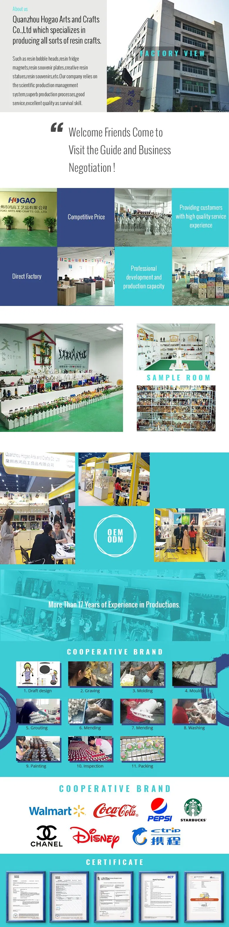 We're a specialized resin/ceramic products manufacturer. Our products range contains resin bobble head dolls, resin snowglobes, resin fridge magnets, resin photo frames, resin fountains, resin statues including angels, animals and so on, can be used for home decoration, festival gift or company promotion.