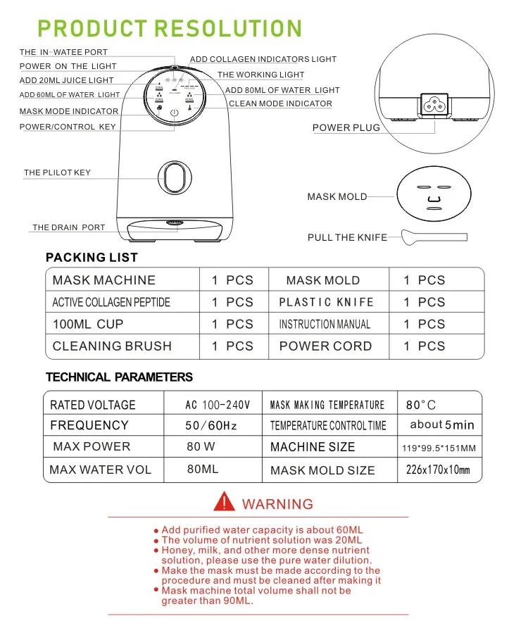 | Package Content | Machine, Adapter, Cleaning brush, Measuring cup, Scraper, Mask plate, Manual, 32* Mask peptides |